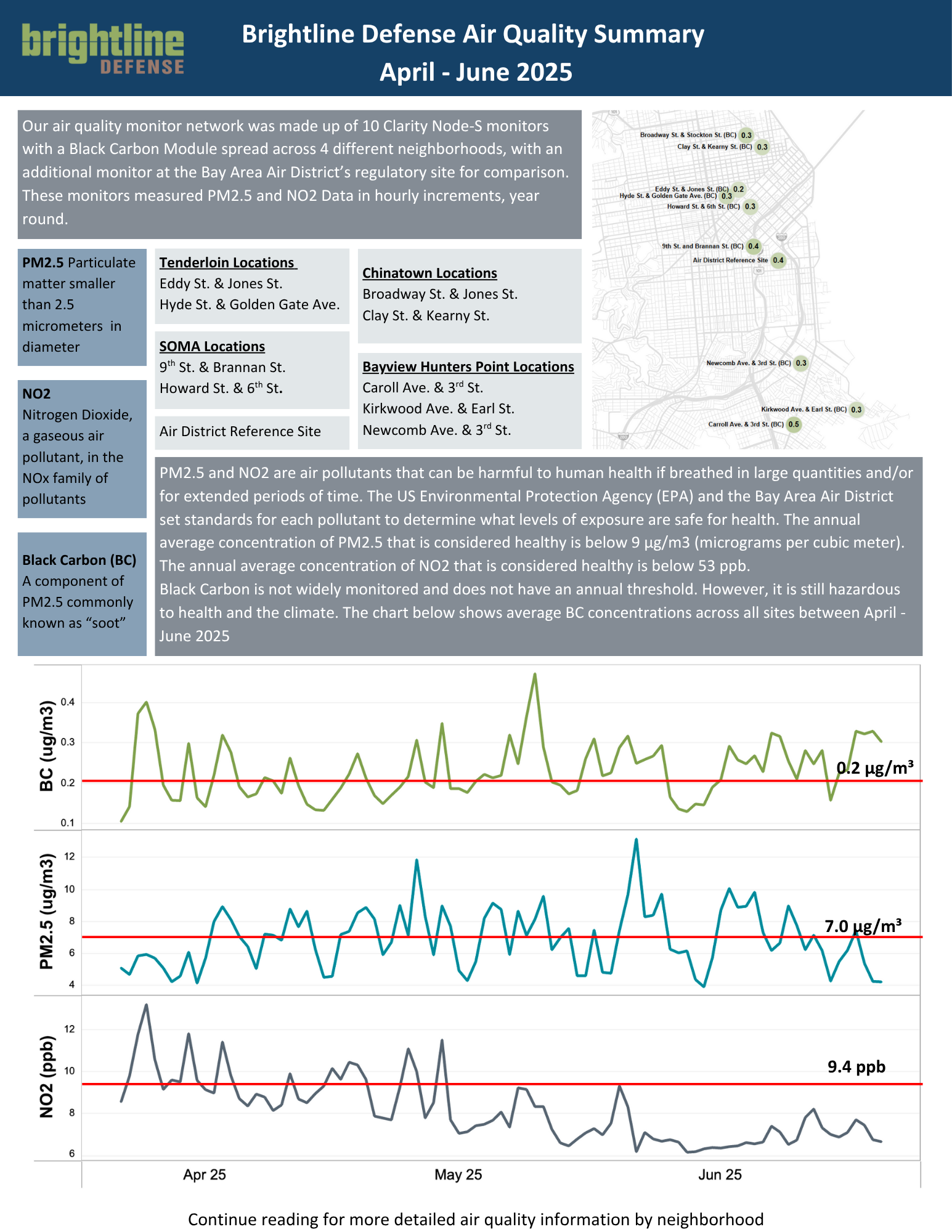 Download our 2025 Quarter 2 Air Quality Data report, summarizing the local air quality of Eastern San Francisco across Brightline's air quality sensors. Review Nitrogen Dioxide, PM2.5, and Black Carbon trends in San Francisco's Chinatown, Tenderloin, Bayview Hunters Point, and South of Market neighborhoods.